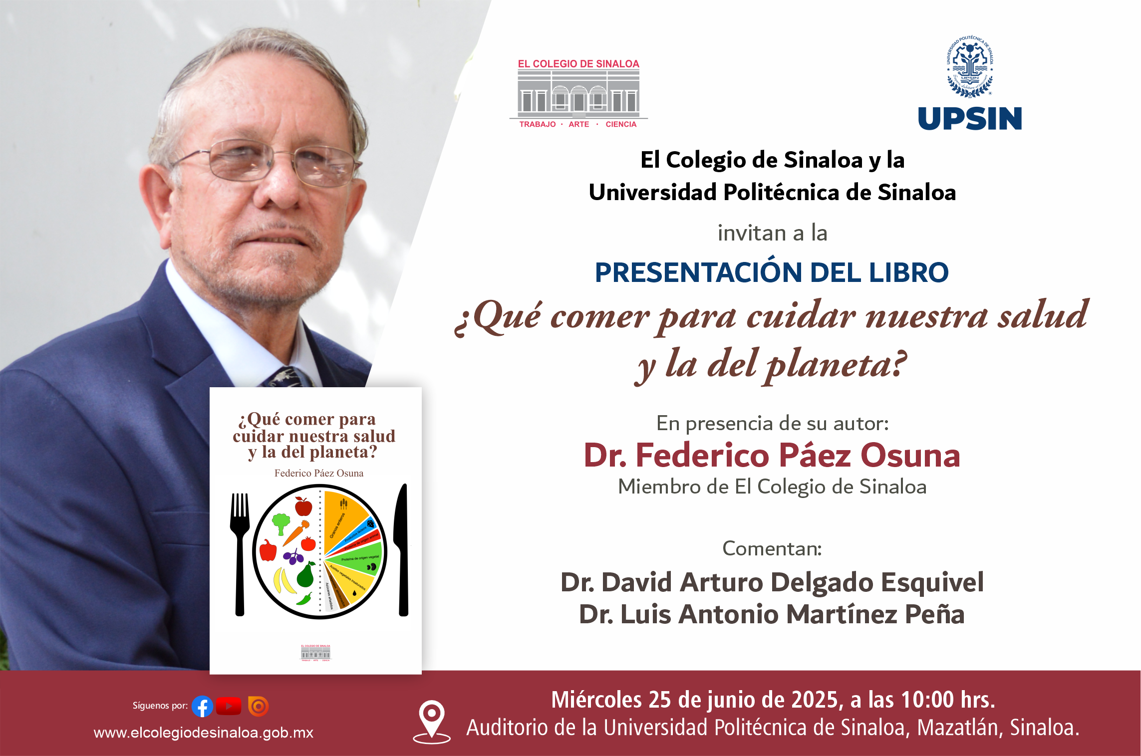 Como parte de sus actividades como miembro de El Colegio de Sinaloa, el Dr. Federico Páez Osuna presentará su libro más reciente: ¿Qué comer para cuidar nuestra salud y la del planeta? La cita es el miércoles 25 de junio del año en curso, a las 10:00 hrs., en el auditorio de la Universidad Politécnica de Sinaloa (UPSIN), del puerto de Mazatlán. La entrada es libre.