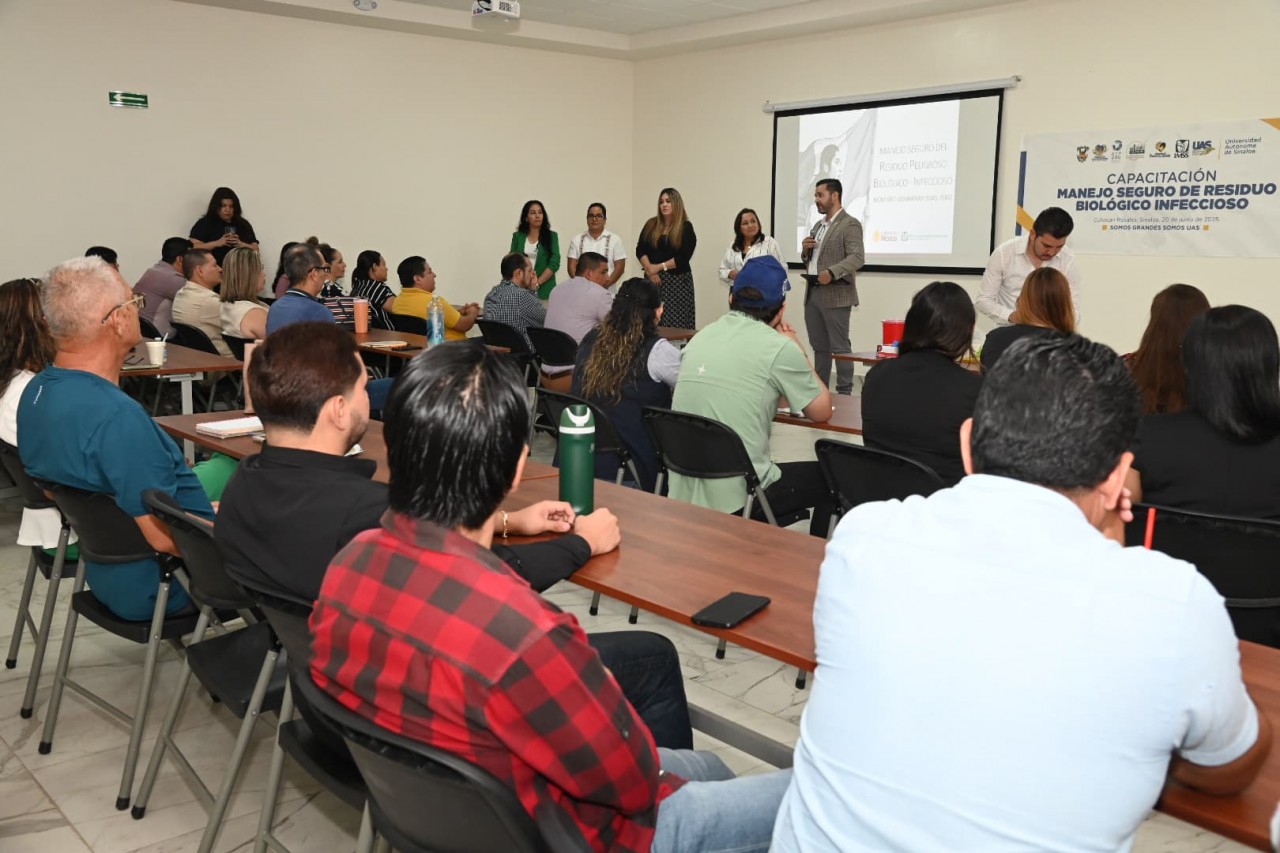 Con la meta de proteger la salud pública, el medio ambiente y el personal que labora con residuos, la Universidad Autónoma de Sinaloa (UAS), a través de la Unidad de Bienestar Universitario, la Dirección de Prestaciones Sociales y la Dirección del Sistema de Gestión de la Calidad, presentó la capacitación “Manejo Seguro de Residuo Biológicos Infecciosos” a cargo de la Coordinación de Salud en el Trabajo del Instituto Mexicano del Seguro Social (IMSS).