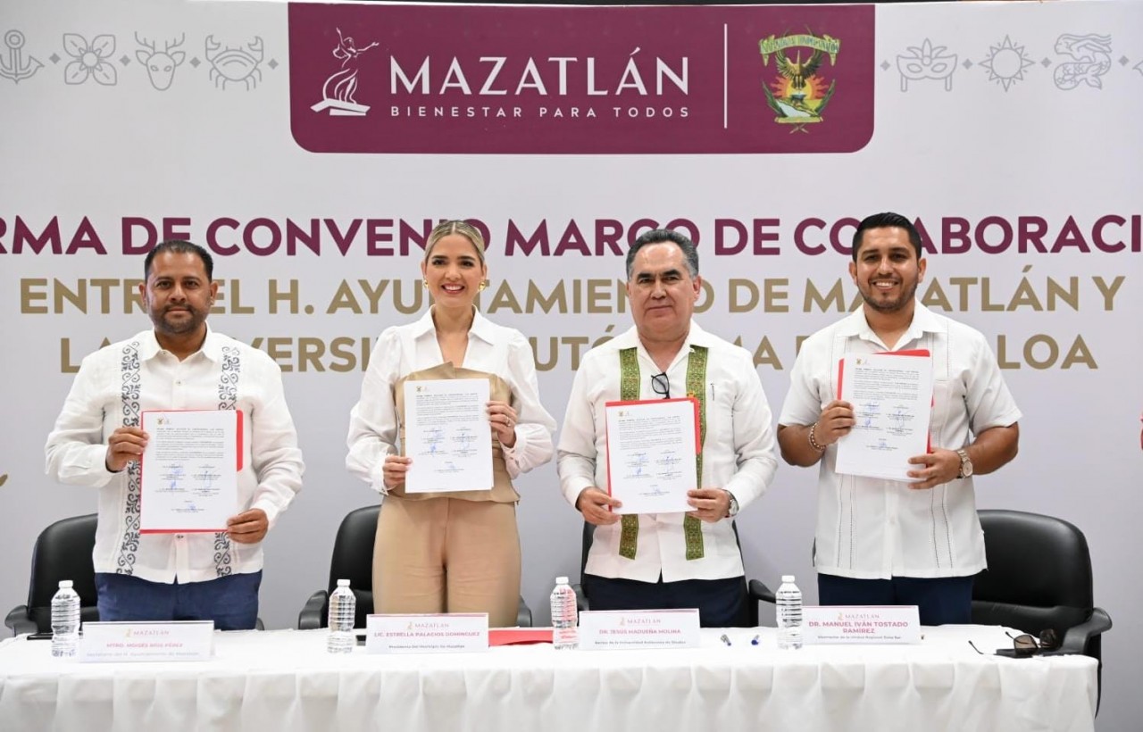 La Universidad Autónoma de Sinaloa (UAS), a través de su Rector, el doctor Jesús Madueña Molina, firmó Convenio General de Colaboración con el H. Ayuntamiento de Mazatlán, representado por la presidenta municipal licenciada Estrella Palacios, con el cual se fortalecen los lazos entre ambas instituciones en beneficio de la comunidad universitaria y la sociedad mazatleca.